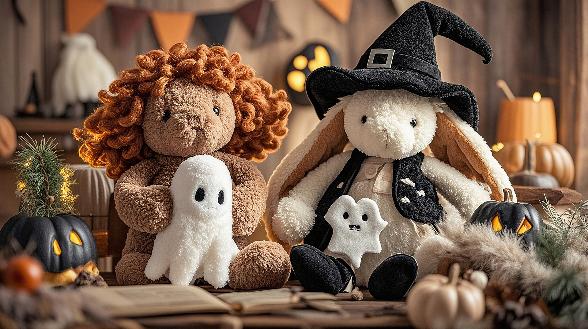 With Halloween as the theme, a charmingly cute pumpkin boy character has been created. He wears a pumpkin hat carved with a classic ghost face, a black little cape with vampire elements, and holds a tiny ghost prop. His adorable expression perfectly blends with the festive atmosphere. Surrounding him are miniature pumpkins, blue cobwebs, witch hats, and other decorations, as if he is in a whimsical Halloween trick-or-treat party. It retains the mysterious fun of the holiday while appealing to collectible toy enthusiasts with its cute style, making it an excellent choice for Halloween-themed collections and decorations.